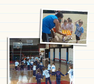 Actividades pre-deportivas y deportivas de conjunto, utilizando como espacio cubierto el gimnasio de basquet y al aire libre las canchas de hockey, handbol y fútbol.
